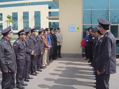 為進(jìn)一步推進(jìn)警民共建,加強治安保衛(wèi),在公司所在地公安機關(guān)的直接領(lǐng)導(dǎo)和全力支持下,公司警衛(wèi)日前完成整體改組,改組后已由原來的傳達(dá)警衛(wèi)人員轉(zhuǎn)換為業(yè)務(wù)受公安機關(guān)直接領(lǐng)導(dǎo)的保安人員。2006年4月25日上午湖州經(jīng)濟開發(fā)區(qū)有關(guān)領(lǐng)導(dǎo)和公司總經(jīng)理與換裝一新公司保安人員在公司東大門為公安機關(guān)駐湖州機床廠警務(wù)室舉行揭牌儀式。